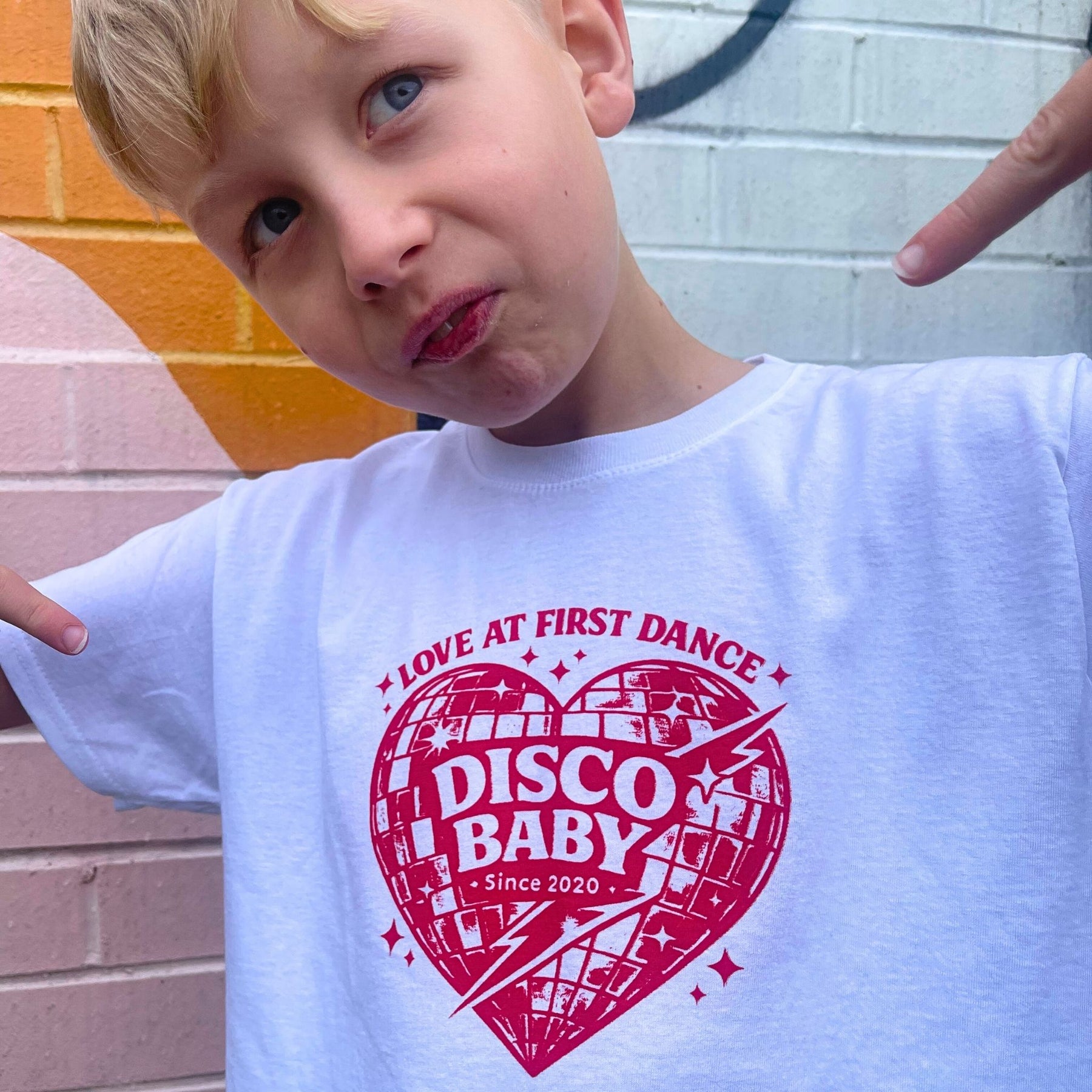 • Retro Disco Baby heart graphic with “Love At First Dance” slogan